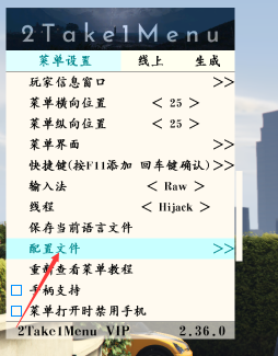 然后上游戏注入菜单 点击 菜单设置 选项 往下拉到 配置文件 如图操作: