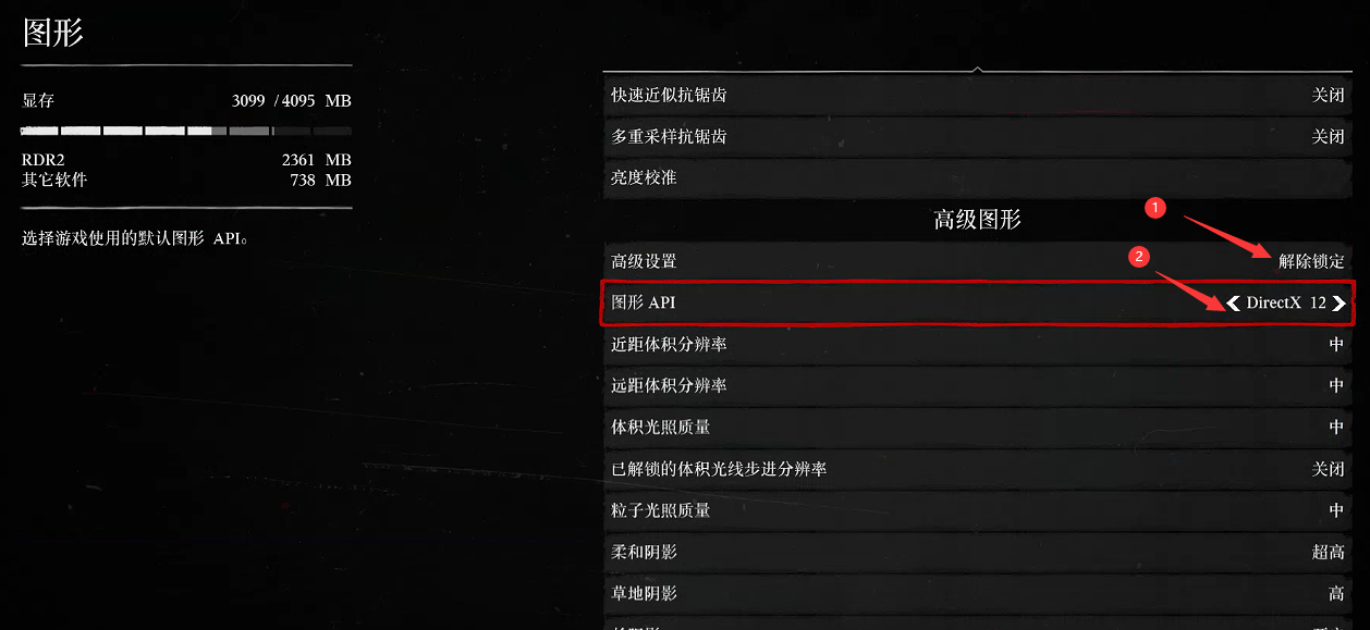 游戏设置-图形-高级图形-图形API(若灰色无法修改,将上方高级设置解除锁定)-修改为DirectX12